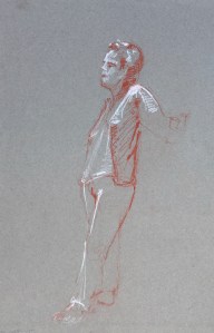 One fifteen minute pose. Conté pencil tightened with conté crayon on pastel paper. 32.5 x 50 cm or 13 x 19 3/4 in.
