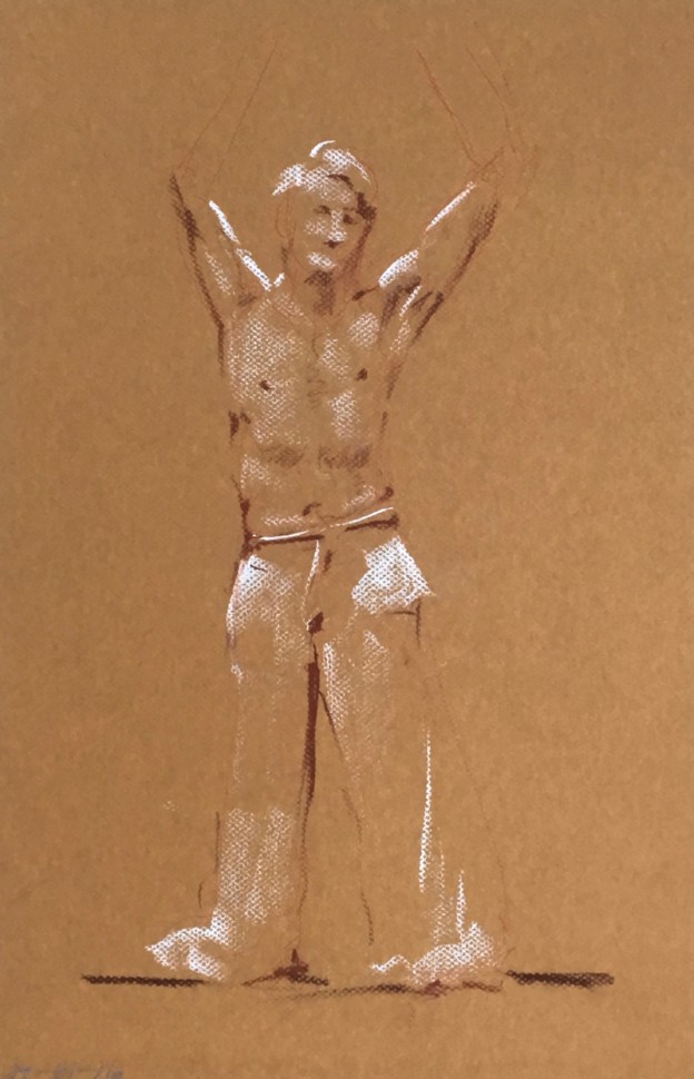 Two four minute poses. Decided to use pastel paper for the quick sketches tonight. I usually don’t do that since it is more expensive. But it does possess a different tactile quality than the cheap sketching paper – allowing for more drag on the conté crayon. Sometimes you want that, sometimes you don’t. 32.5 x 50 cm or 13 x 19 3/4 in.