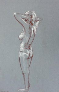 Two fifteen minute poses. Conté pencil highlighted with conté crayon on toned pastel paper. 32.5 x 50 cm or 13 x 19 3/4 in.