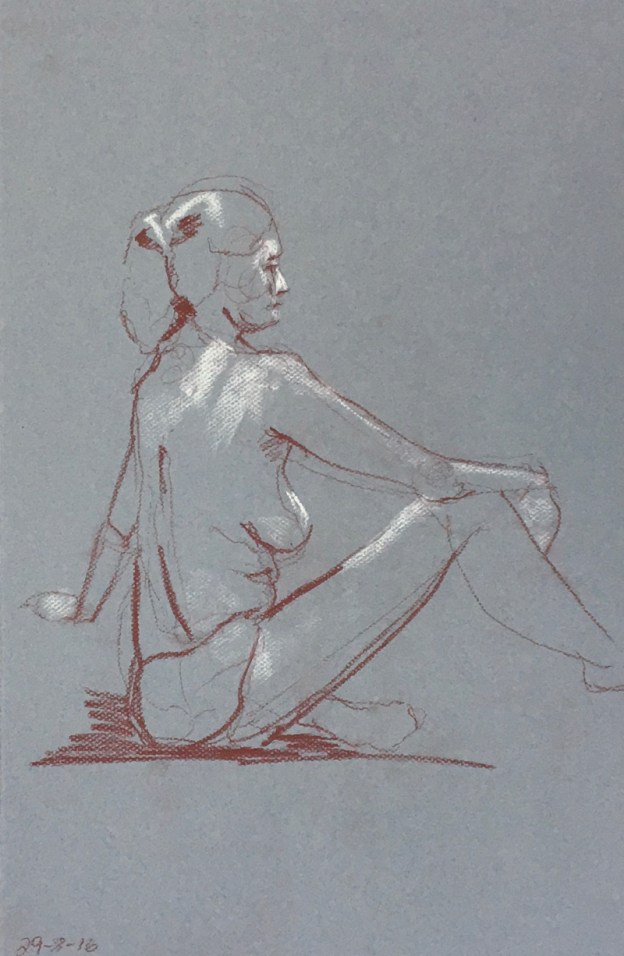 Two fifteen minute poses. Conté pencil highlighted with conté crayon on toned pastel paper. 32.5 x 50 cm or 13 x 19 3/4 in.