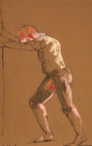 The model tonight was a new (to me) guy: Frank. Wow! Amazing! Very muscular, very athletic poses, a real Mars-bar with reddish hair and fair skin (playful and silly too). Big head proportionally – yet not out of proportion. A pleasure to draw. The four minute gesture poses really made my day. During the fifteen minute studies, I got a bit overwhelmed by my warm-toned pastels of a warm subject on that warm paper. Luckily, a few made the grade.