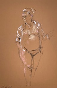 The model tonight was a lady named Angie. I scrawled her name across one of my drawings so I would not forget it. She is a large, jolly lady who I enjoy drawing. She takes good poses and seems to know intuitively what would be interesting for those of us on the other side. Below, two pastels on tinted Canson pastel paper and five charcoals on tinted sketching paper.
