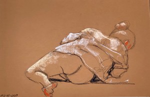 Five minute gesture study. Charcoal pencil on toned recycling paper. 35 x 50 cm.