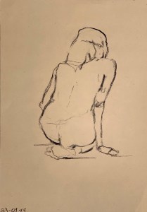 Three minute gesture study. Charcoal on tinted sketching paper. 35 x 50 cm.