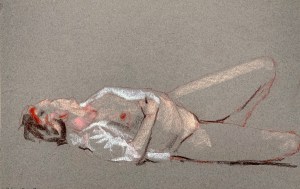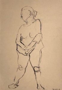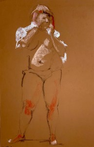 The first one is appropriate for any two dimensional drawing (like the three minute gestures) but the second two are especially useful for the fuller development of any drawing (for example, the fifteen minute poses included here). Also, you do not need to restrict yourself to figurative work to apply these rules. They apply to abstraction and can help you to evaluate why a good abstract piece actually works – when it does. And, as I think about it, I would add a fourth: the appeal of texture. En français: l’attrait textuel?
