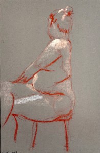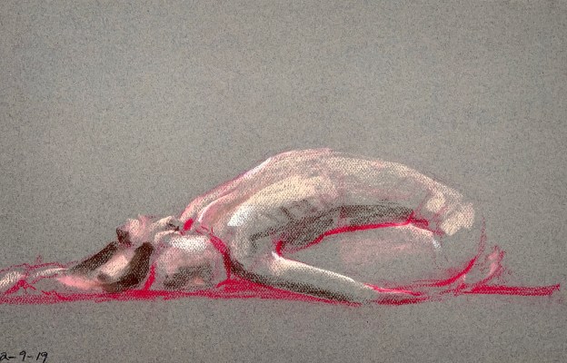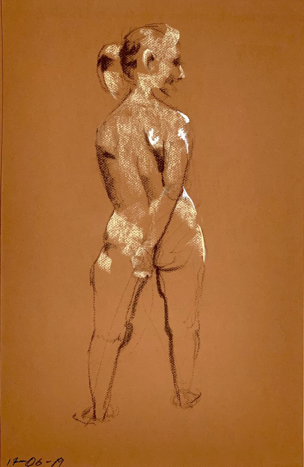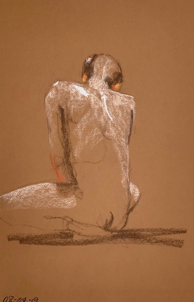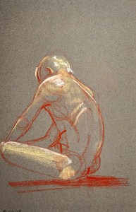 Four fifteen minute studies. Conté pencil and crayon on Canson pastel paper. 32.5 x 50 cm or 13 x 19.75 in. For the longer poses I usually spend about five minutes getting the pose down on the paper using conté pencil or crayon. My lines are fairly light. Once I start to see the figure emerging there, I begin by applying swaths of pastel (and touches of color). Highlights first, then usually in the last few minutes, a few strokes to ground the weight and shadow. If I have another minute, I’ll add in white for the strongest highlights for that final punch. All four of these longer studies felt worth saving and spotlighting but I can only spotlight one, so I had to choose. As ever, thanks, Bruno (our host) and thanks, Sooren.