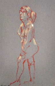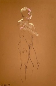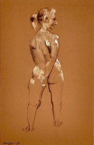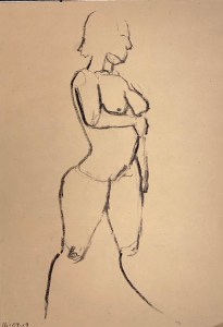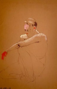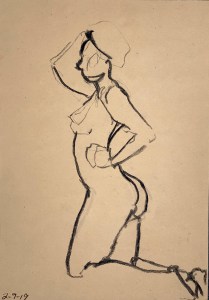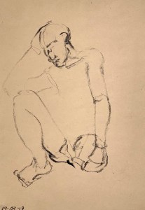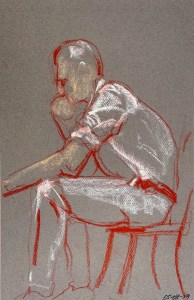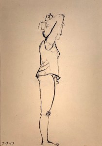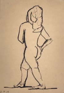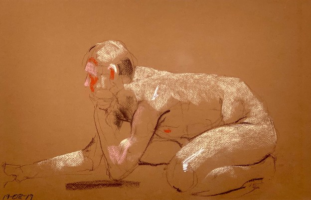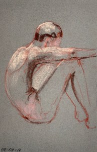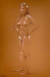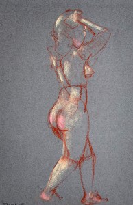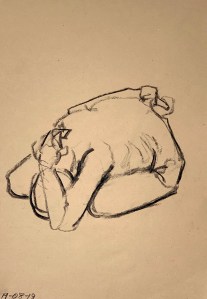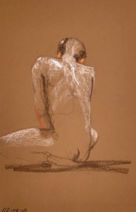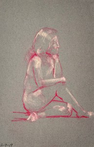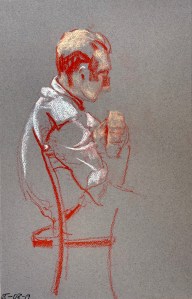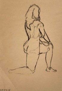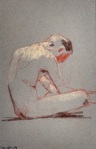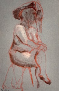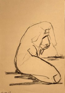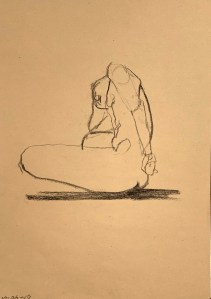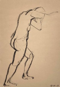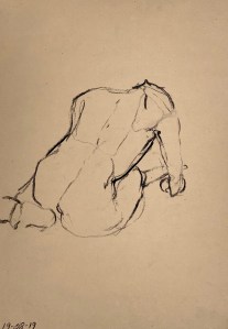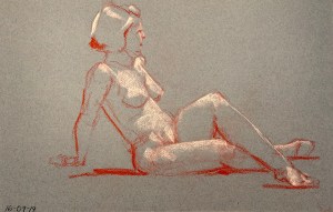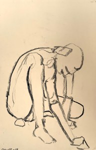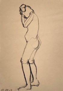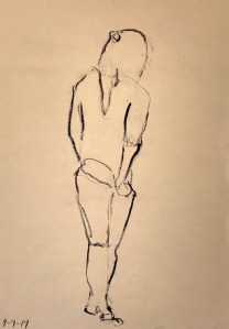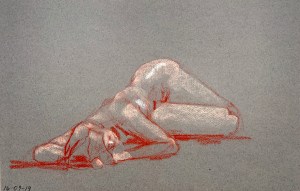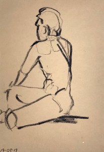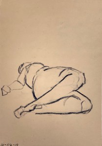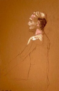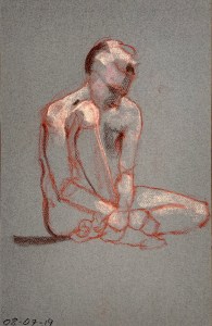 Three weeks in a row with, the same model, Sooren, but never boring, because he’s really good. Why? He takes interesting poses and holds them remarkably well. He has an interesting and challenging body to draw. And he has a sweet disposition (not required for figure drawing but adds to the friendly atmosphere). Here below is the evening’s catch.