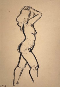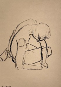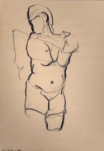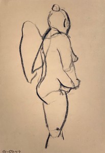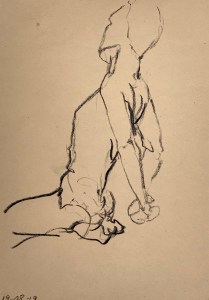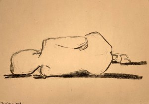Six four minute studies. Black charcoal on tinted sketching paper. 35 x 50 cm or 13.75 x 19.75 in. Some people approach figure drawing from the point of view of form (anatomy, skeletal, muscular). I am deeply interested in that (because I don’t want to distort – at least not intentionally) but also I have seen that over time I am just as, or even more, interested in conveying a sense of the livingness of the gesture. So if I produce a drawing that has that, I am pleased, even if the placement on the page could be better or the proportions are slightly off. Always room for improvement in that department. Nevertheless, the real fun of figure drawing is the experience itself, warming up the muladhara and the sex chakras; the results, footprints in the sand.