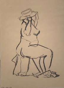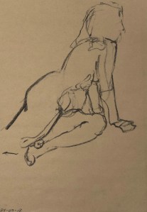 So here tonight, after returning to Brugge, I can feel and see some progress being made. My three minute gestures are currently trash (I am still moving too slowly) but all of the fifteen minute studies were “keepers”. Before I began my studies my batting average was maybe 50%? So my proportions are improving and I experienced great joy in discovering the various skeletal protrusions I had studied. Even the final pose of the night, a five minute energetically expansive one, fell into place quite quickly. Ha!