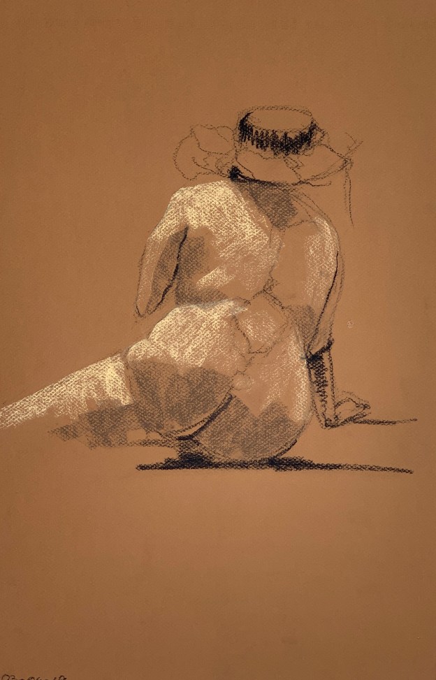 Fifteen minute figure study. Charcoal pencil on toned recycling paper. 35 x 50 cm