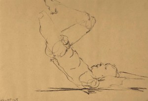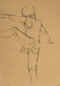 Five minute gesture study. Charcoal pencil on toned recycling paper. 35 x 50 cm.