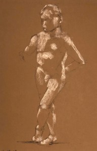 So here tonight, after returning to Brugge, I can feel and see some progress being made. My three minute gestures are currently trash (I am still moving too slowly) but all of the fifteen minute studies were “keepers”. Before I began my studies my batting average was maybe 50%? So my proportions are improving and I experienced great joy in discovering the various skeletal protrusions I had studied. Even the final pose of the night, a five minute energetically expansive one, fell into place quite quickly. Ha!