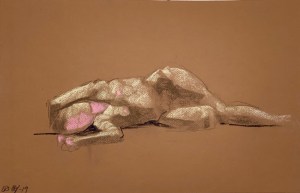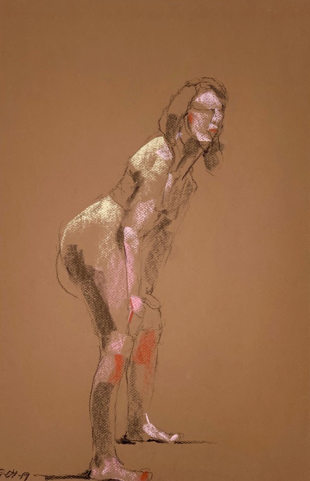 The model tonight was a lady named Angie. I scrawled her name across one of my drawings so I would not forget it. She is a large, jolly lady who I enjoy drawing. She takes good poses and seems to know intuitively what would be interesting for those of us on the other side. Below, two pastels on tinted Canson pastel paper and five charcoals on tinted sketching paper.