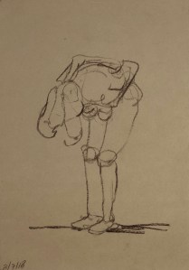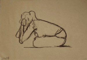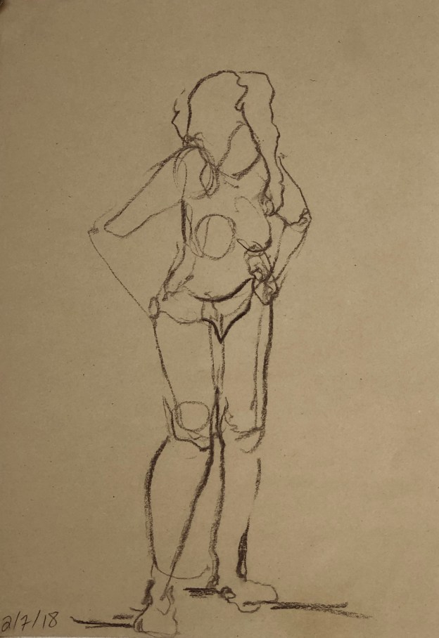 I would say that the same is true with figure drawing (only it’s much less dangerous). Feeling connected to the model, the chalk, the paper and what is happening on it, the music, the other people in the room: it’s all one experience which, most especially when I forget myself, tends to go well. So, for me, drawing is not about taking credit, rather its about getting the me out of the way and letting experience itself speak.
