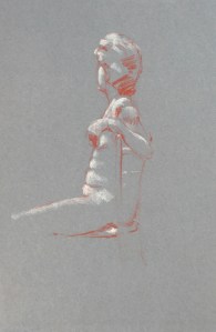 Tonight I experimented with doing one of the 15 minute poses on sketching paper instead of pastel paper. The tactile feel was different, and also the way the paper received the strokes of the chalk. Less receptive. But OK, the drawing turned out alright – but I wouldn’t do it again. Too much of a struggle. I prefer the other 15 minute study on the darker toned pastel paper but wanted to highlight the sketch paper one just to illustrate the difference. So two fifteen minute studies, one above and one below. Conté pencil highlighted with conté crayon on toned paper. 32.5 x 50 cm or 13 x 19 3/4 in.