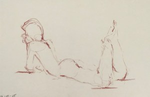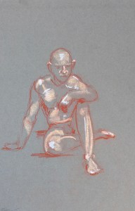 Here below are three fifteen minute poses. Conté pencil highlighted by conté crayon on toned pastel paper. 32.5 x 50 cm or 13 x 19 3/4 in.