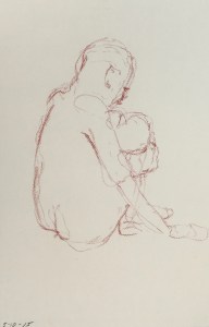 Some evenings are pure magic. This was one. What are the ingredients that made it so? I’m not entirely sure but I can say that a good model does make all the difference. The model tonight was a man I had never seen before (or since) but he was so good. How so? His poses were not particularly athletic yet he seemed to emanate a quiet self-acceptance, sitting, standing, crouching. He posed naked for the four minute poses but clothed for the longer fifteen minute ones. Due to the fact that he had clothes on, it gave me more colors and textures to work with. For lack of a real name I call him Tintin because he reminds me of that character from the Belgian comics.