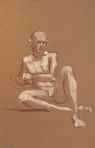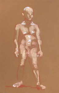 One of the more frequent models, Soeren. A very tall, lanky fellow with big hands and feet. It is often difficult to get all of his splayed out body on one piece of paper.  I like the highlighted one because of the accent of a warm conté crayon for the face and feet.