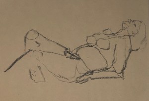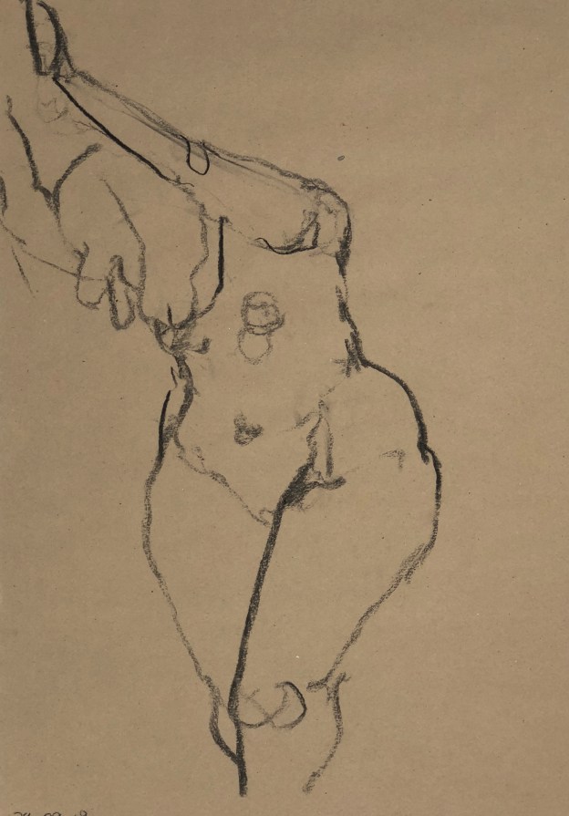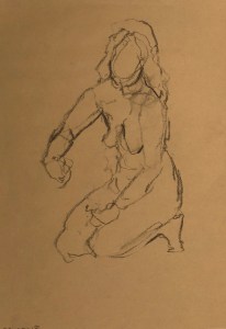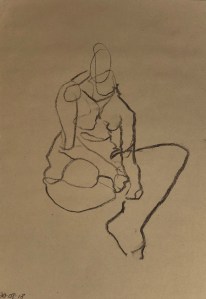 Three four minute poses. Black charcoal on tinted sketching paper. 35 x 50 cm or 13.75 x 19.75 in.