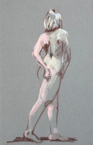 Back after spring break. And I, head deep in writing my thesis, happy for a-no-mind interlude. The featured image here reflects my continuing experimentation with colorful pastels – and this exciting dark brown-gray (umber) for the skin-tone shadows. Wow!