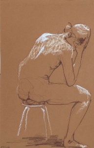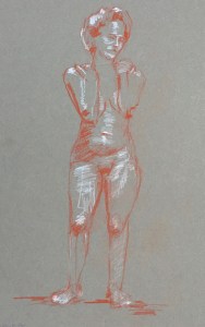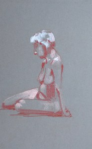 Four fifteen minutes poses. Conté pencil and crayon on Canson pastel paper. 32.5 x 50 cm or 13 x 19.75 in.