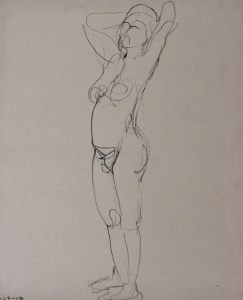 The same model tonight as the one we had a few weeks ago: the one with the props. Fun! So she pulled out her black wings, black stockings and black hat with black veil. She is a heavy weight figure. There is something deeply satisfying about feeling the weight of such bodies; drawing rotating circles for the major bodily forms (harder to do with skinny, active models), allowing them to slowly emerge from the paper. Eight drawings below.