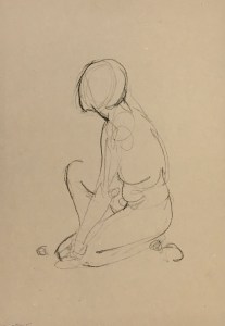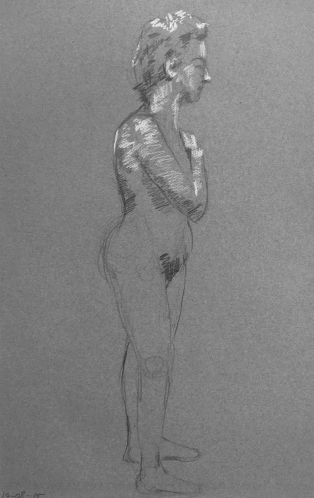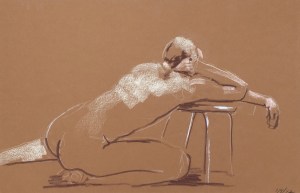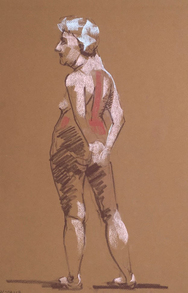 Four fifteen minutes poses. Conté pencil and crayon on Canson pastel paper. 32.5 x 50 cm or 13 x 19.75 in.