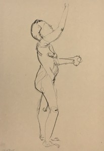 The same model tonight as the one we had a few weeks ago: the one with the props. Fun! So she pulled out her black wings, black stockings and black hat with black veil. She is a heavy weight figure. There is something deeply satisfying about feeling the weight of such bodies; drawing rotating circles for the major bodily forms (harder to do with skinny, active models), allowing them to slowly emerge from the paper. Eight drawings below.