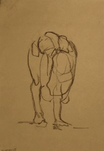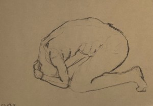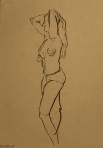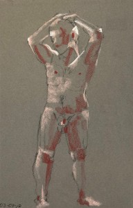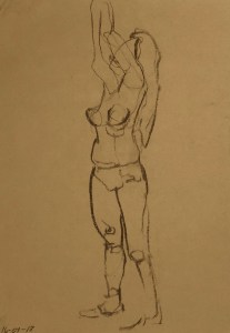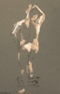 Our model tonight was one of our regulars, Soren. He’s really long and lanky which at times can be challenging just fitting all his body parts onto one page. Often I don’t try. Tonight, at least in the fifteen poses, ones he took ones that were more compressed – but not too compressed – making it possible to see where the gesture lies.