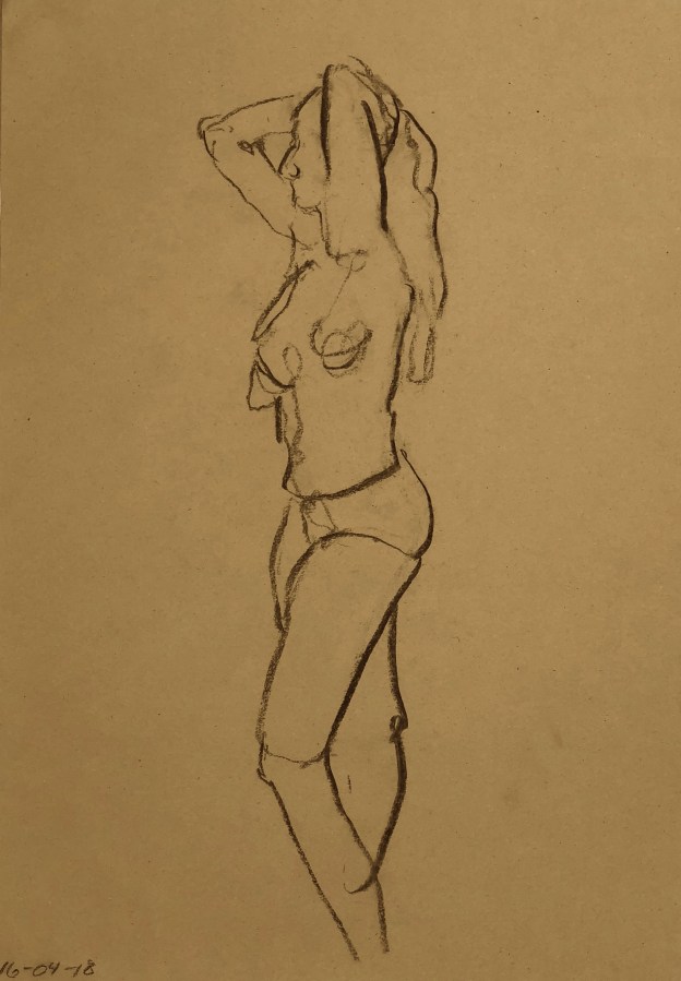 And four four minute gesture poses. Black charcoal on tinted sketching paper. 35 x 50 cm or 13.75 x 19.75 in.