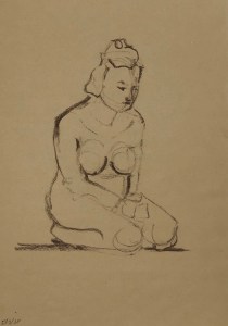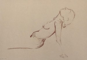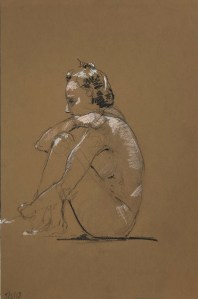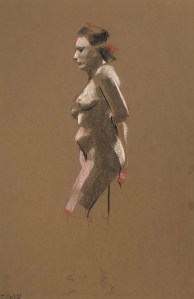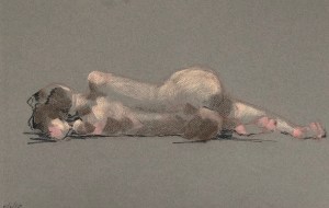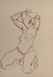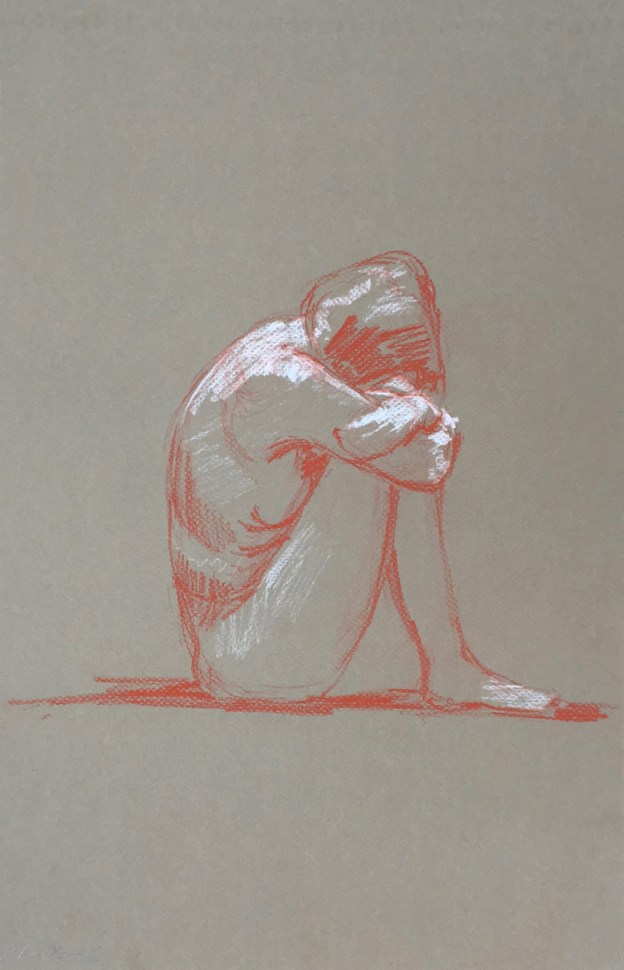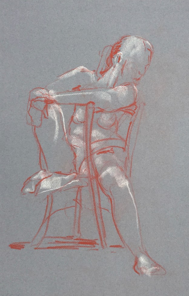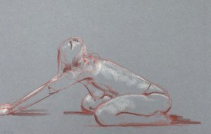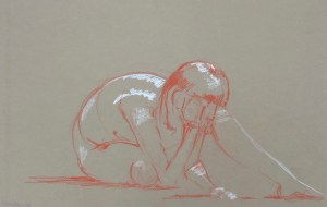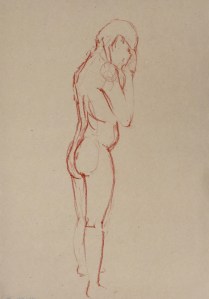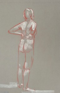 Here below five fifteen minute poses. 32.5 x 50 cm or 13 x 19.75 in. Conté crayon touched up with conté pencil on tinted Canson pastel drawing paper.