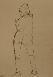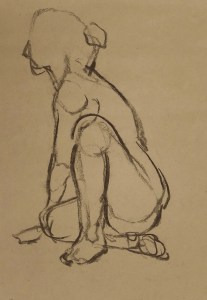 Three four minute poses. 35 x 50 cm. or 13.75 x 19.75 in. Black charcoal on tinted sketching paper.