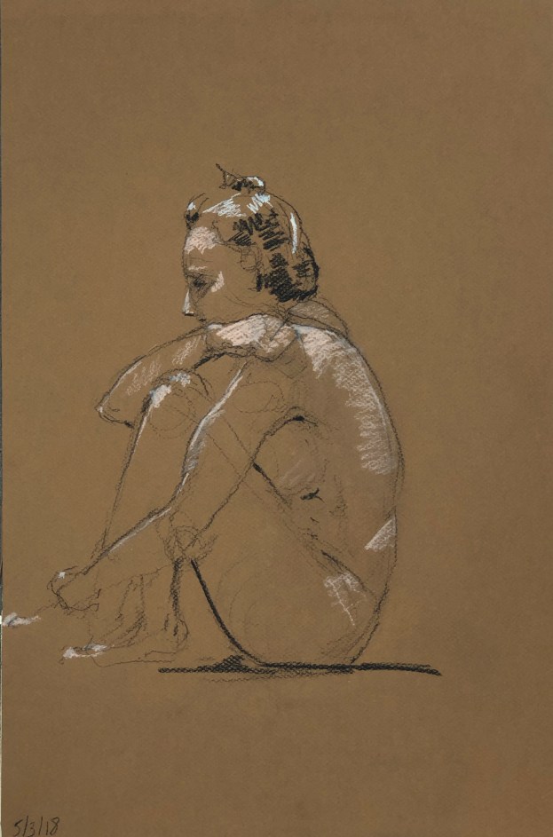 I would say that the same is true with figure drawing (only it’s much less dangerous). Feeling connected to the model, the chalk, the paper and what is happening on it, the music, the other people in the room: it’s all one experience which, most especially when I forget myself, tends to go well. So, for me, drawing is not about taking credit, rather its about getting the me out of the way and letting experience itself speak.