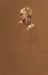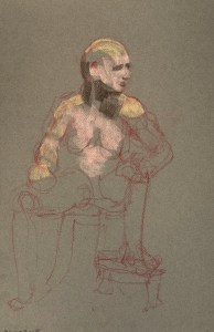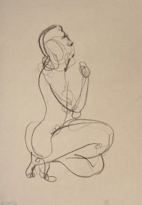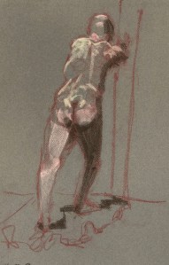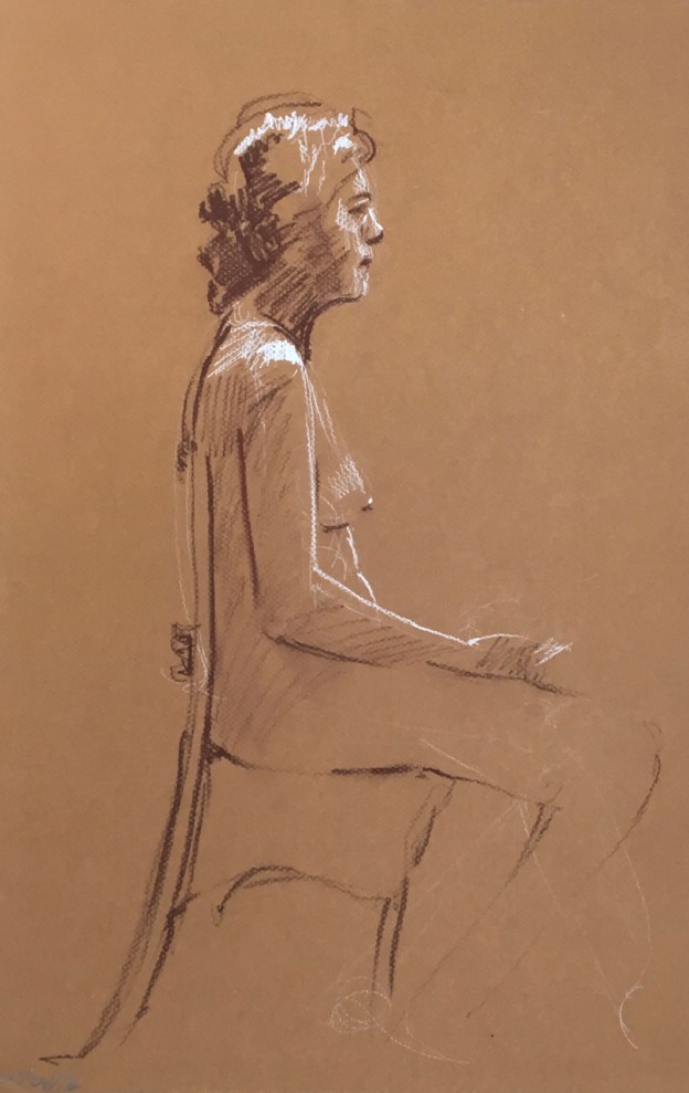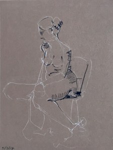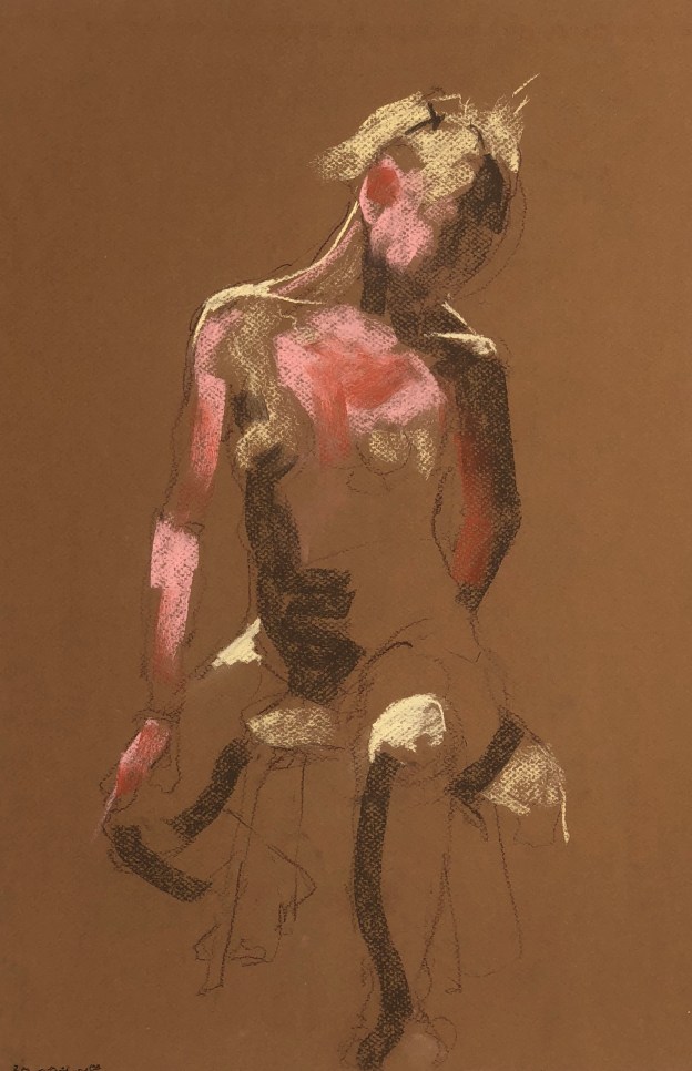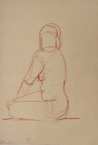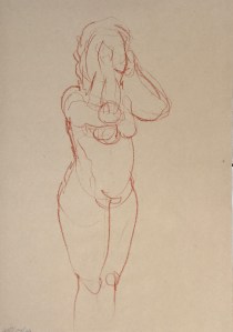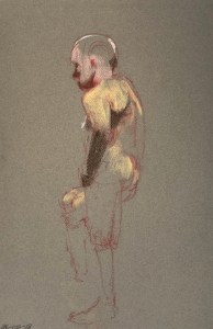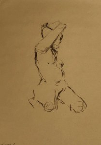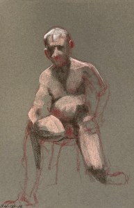 Fifteen minute poses.Conte crayon on tinted Canson pastel paper. 32.5 x 50 cm. or 13 x 19.75 in.