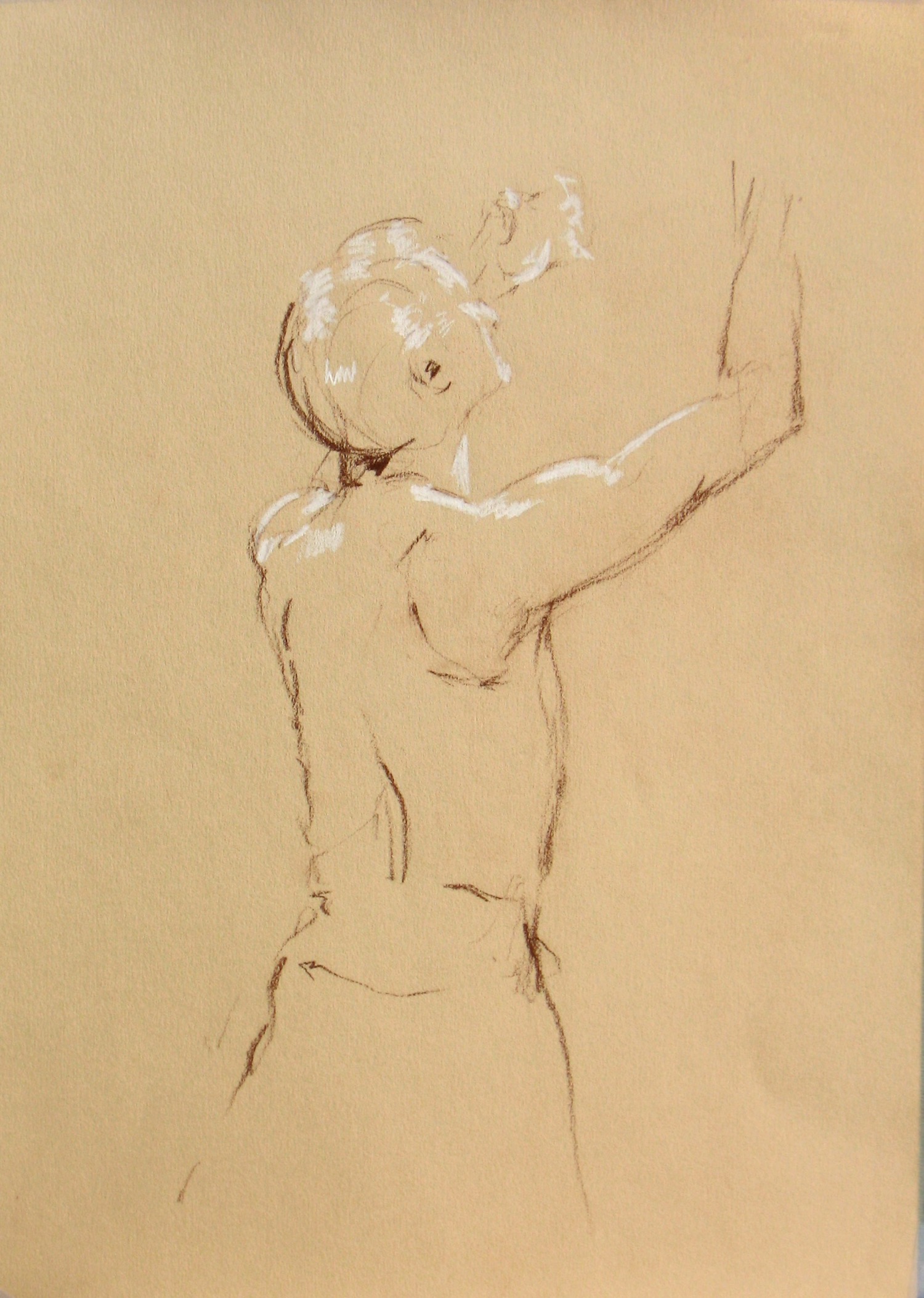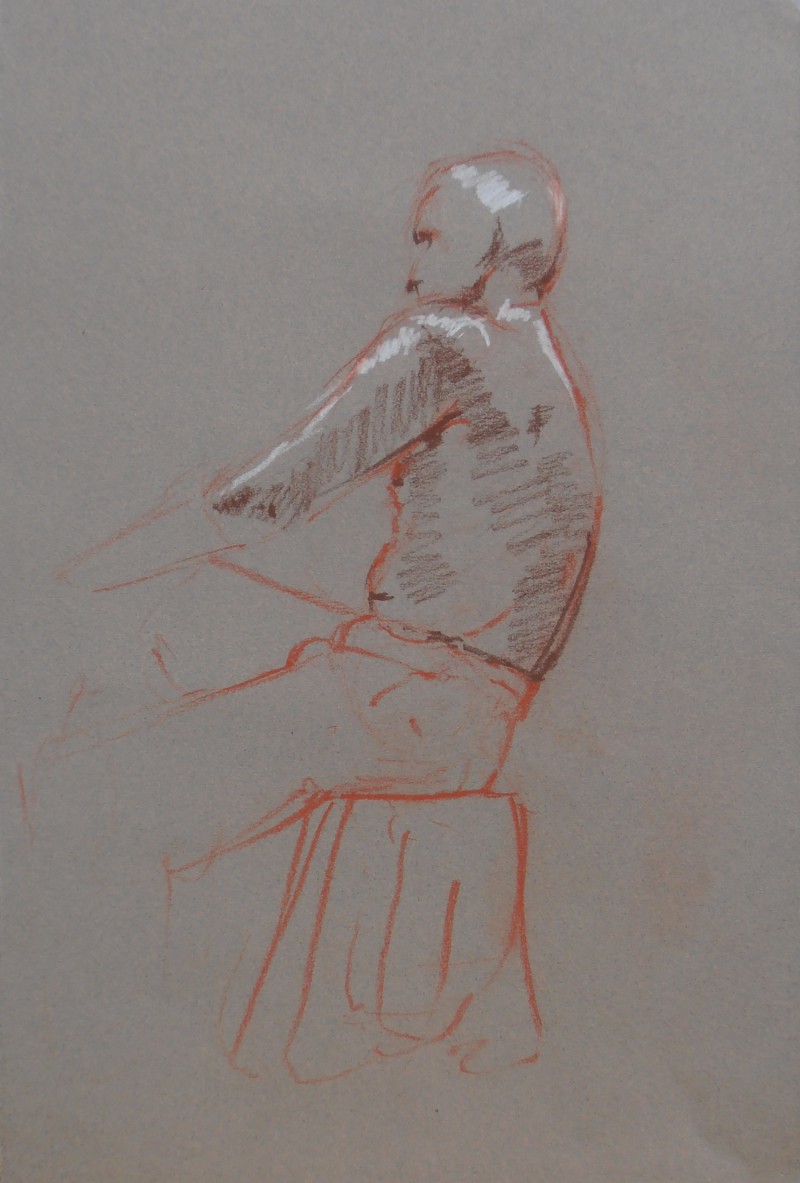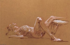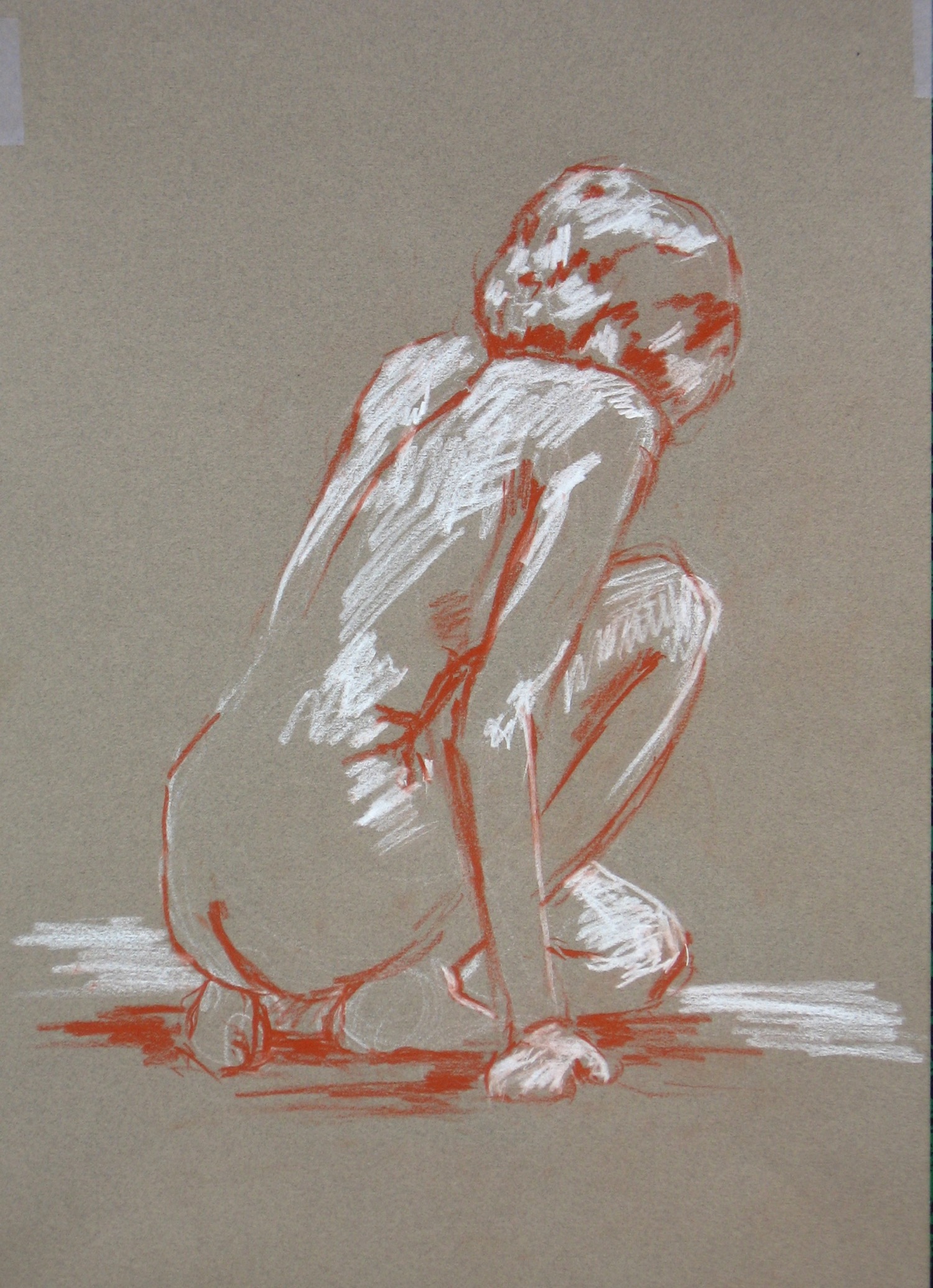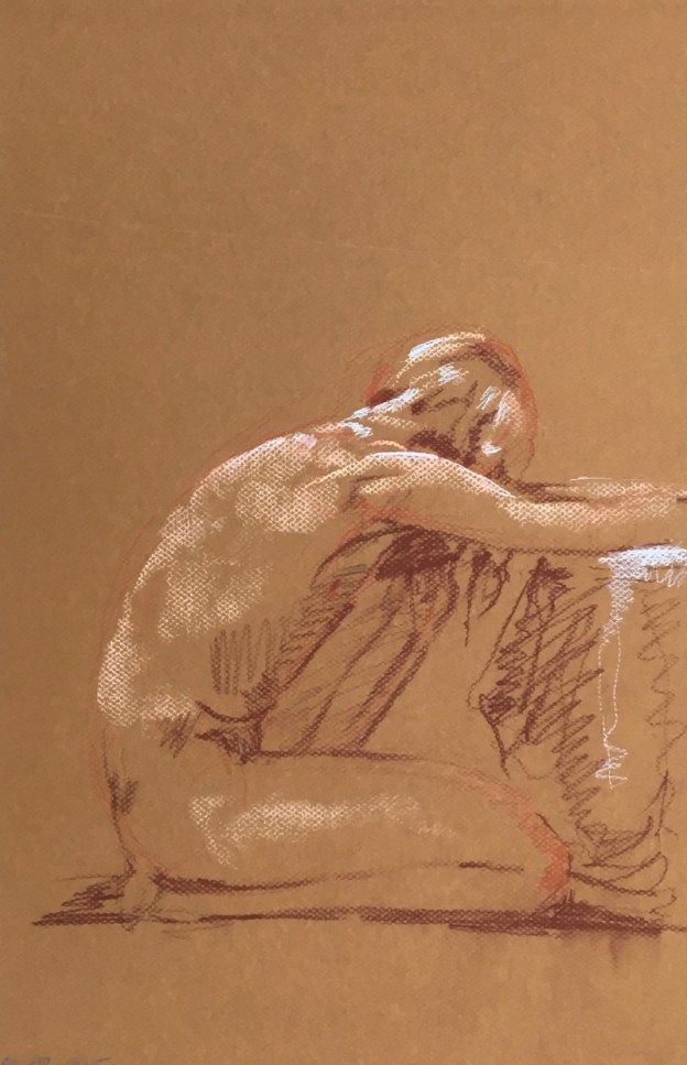 Tonight felt like a bit of a breakthrough for me. I’ve just started using the sienna toned paper. But which color to use to draw the figure? And then what pastels to use for the highlights? It needs to become intuitive – as it did in this spotlighted one.