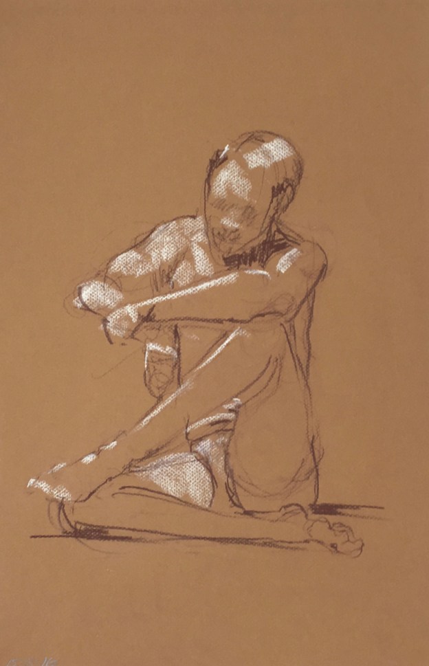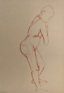 Two fifteen minute poses. Conté crayon on Canson tinted pastel paper. 32.5 x 50 cm or 13 x 19.75 in.