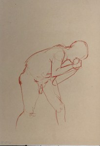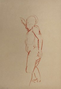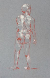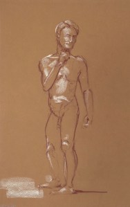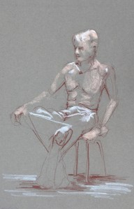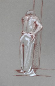 The model tonight was fantastic. The second time I remember drawing him. He’s really good because he seems to know intuitively what to do. However, even though the model can be fantastic and I resonate with him/her, I can still have a mediocre evening. Tonight was that way, principally, I think due to my own state, as I was not feeling very well. Even in such cases, it’s always good to go out and try, and see what happens.